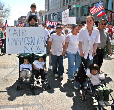 SALT LAKE CITY – Con 25,000 personas reunidas el 9 de abril en el centro de Salt Lake City con motivo de la Marcha por la Dignidad por los derechos de inmigración, los organizadores, la Policía de Salt Lake City, y el alcalde de Salt Lake City "Rocky" Anderson expresaron su sorpresa por el gran número de asistentes al evento. Los oficiales de la Ciudad consideran esta marcha, la cual empezó con una invocación por el Padre James E. Flynn de la Parroquia de Sta. María de la Asunción en Park City, la demostración más grande en la historia de la ciudad desde la Guerra de Vietnam. La calle State Street en Salt Lake City, diseñada por Brigham Young para que tuviera una amplitud lo suficientemente grande para que un vagón jalado por seis caballos pudiera dar la vuelta, se convirtió en un mar de gente que apoya una reforma migratoria humanitaria. La mayoría iban vestidos de blanco, el color de la paz, y llevaban banderas Americanas de todos tamaños, desde las banderas gigantescas hasta las de bolsillo. Ellos entonaban "Sí se puede." La organización Utah Minuteman y otros, cerca de 200 personas, también caminaron por State Street por delante de los defensores de inmigración, con la policía y una falange de voluntarios hispanos, vestidos con camisas negras con la palabra "Peace" (Paz) impresa en blanco, manteniendo una distancia sustancial entre los dos grupos. Representantes de un número de grupos hispanos también estuvieron presentes para ayudar a la policía a mantener a la muchedumbre en orden y para pararse entre miembros de los grupos opuestos para mantener la paz. La mayoría de los representantes de los grupos anti-inmigración hablaron ya fuera de enviar de inmediato a todos los inmigrantes ilegales de regreso a sus países de origen, o simplemente insisten que se apliquen las leyes de inmigración actuales. Unos pocos llevaban carteles pidiendo que se cierren ahora las fronteras de los Estados Unidos. La policía retrasó el comienzo de la Marcha, programada para la 1:30 de la tarde, hasta las 2:15 cuando el Alcalde Anderson llegó. Portando una camisa blanca, entrelazó sus brazos con los organizadores de la Marcha y guió a miles de personas desde el Edificio de la Ciudad y Condado de Salt Lake hasta el Edificio del Capitolio del Estado donde escucharon varios discursos. Durante el mitin y la Marcha del domingo, la gente expresó su descontento con la Resolución 4437 de la Cámara de Representantes. Esta propuesta haría que la entrada y la permanencia ilegal en los Estados Unidos fueran consideradas un crimen federal, y podría hacer que el ayudar a gente indocumentada se convirtiera en una ofensa criminal. La resolución estaría en conflicto con la enseñanza Católica, la cual llama a que recibamos al inmigrante y al extranjero y a que ayudemos a aquellos que lo necesitan sin importar su situación legal. Líderes Católicos, incluyendo al Cardenal Roger M. Mahony de Los Angeles, han dicho que la aprobación de esta resolución no prevendrá que ellos ayuden al pobre y al marginalizado. «Trabajamos, producimos, y pagamos impuestos,» decía un cartel llevado por uno de los participantes hispanos de la Marcha. «No somos criminales.» Dee Rowland, enlace de la Diócesis de Salt Lake City con el gobierno, marchó con su familia en medio de la muchedumbre. «Caminando con la multitud de familias en la compañía de mi familia fue una de las tardes más felices de mi vida», ella dijo. Carteles llevados principalmente por niños reflejaban uno de los aspectos más preocupantes de la resolución – el rompimiento de familias de trabajadores indocumentados cuyos hijos nacieron en los Estados Unidos: «No desbaraten a mi familia». La Asociación de Estudiantes Asiáticos de la Universidad de Utah marchó junto con la multitud que consistía principalmente de hispanos. Sus carteles pedían una reforma migratoria justa para todos. Steven May y su esposa, Leslie, de Mapleton, marcharon con sus dos hijos y con sus sobrinos. «Estamos aquí por nuestros hijos», dijo May, originario de México. «Queremos que tengan el mejor futuro posible, y no lo pueden tener si los inmigrantes no son tratados justamente o si se sospecha de ellos constantemente.» Los jóvenes Carlos Delgado, Diana Favela, y Alex Favela de Kearns llevaban un cartel donde pedían por la dignidad y el respeto para los latinos. «Los trabajadores latinos no son terroristas», dijo Delgado. «Nuestras familias trabajan duro y pagan impuestos.»