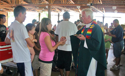 FARMINGTON — Catholics numbering 5,573 from throughout the Diocese of Salt Lake City gathered for the traditional Catholic Day at Lagoon July 8. Knights of Columbus Council 602 sponsored the 99th annual state-wide event to bring Catholic families together. "People who used to come with their parents and grandparents are now bringing their children and grandchildren," said Jeff Itami, grand knight of Council 602. "Our council is the oldest council west of the Rocky Mountains," said Itami. "Council 602 began in 1901, and we started celebrating Catholic Day at Lagoon in 1908." Filomena Fay Lee from Castle Dale, a member of San Rafael Mission in central Utah, remembers coming to Lagoon on Catholic Day with her family when she was young. She grew up in Helper where her father, Tony Ori, was a fourth-degree Knight of Columbus from St. Anthony of Padua Parish. Lee and her fiancé’s family spent the day with her cousins Theresa and William Wheeler, who are members of St. Ann Parish, Salt Lake City. They look forward to this event every year. Olivia Hernandez from St. Henry Parish in Brigham City brought her family of 12 including her children and grandchildren. She has been coming for at least the past 12 years. Families selected a place for their picnic lunches and prepared for Mass in the Canyon Terrace pavilion, which provided shade from the sun and the outside temperature of 99 degrees. The outdoor Mass was celebrated by Oblate of St. Francis de Sales Father James McHugh. Fr. McHugh is the Knight of Columbus state chaplain and a science and chemistry teacher at Judge Memorial Catholic High School. The Mass intention was for the late Oblate Father Richard Blenner, former state chaplain, who died 10 years ago in 1997. Rudy Roca, Council 602 advocate and a member of the Cathedral of the Madeleine Parish, brought his family and their traditional Filipino food. His granddaughter, Caera Roca Navales, sang the communion hymn, "Ave Maria." "This is our main fund raiser," said Vincent Lopez, a Knight of Columbus Council 602 trustee. "Today’s proceeds will be used to cover pro-life activities, funding for the Carmelite Monastery in Holladay, our annual clergy appreciation dinner, and to help our brother knights who are veterans of foreign wars. The Mass collection will be given to Bishop John C. Wester of the Diocese of Salt Lake City for his pro-life fund. "Lagoon representatives are happy to host us because we bring in so many," said Itami. "They give us complementary stuffed animals, free entrance into Lagoon, and a discount on Lagoon ride passes."
