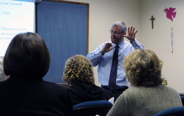 SALT LAKE CITY — The first in a series of presentations on the major teachings of the Second Vatican Council was given Oct. 15 to a diverse group of attendees in The Cathedral of the Madeleine’s Scanlan Hall. Gregory Glenn, the Cathedral’s director of Music and Liturgy, spoke to about 60 people of various ages and religious backgrounds about Sacrosanctum Concilium, The Constitution on the Sacred Liturgy, the first of the four constitutions that came out of the Second Vatican Council. Sacrosanctum Concilium, which may be read in English online at http://www.vatican.va/archive/hist_councils/ii_vatican_council/documents/vat-ii_const_19631204_sacrosanctum-concilium_en.html, was meant to "impart an ever increasing vigor to the Christian life of the faithful; to adapt more suitably to the needs of our own times those institutions which are subject to change; to foster whatever can promote union among all who believe in Christ; to strengthen whatever can help to call the whole of mankind into the household of the Church," according to the document’s first paragraph. Although the goal was to reform the sacred liturgy so there would be greater participation by the laity, "there was never the notion that we were going to cut ourselves off from the liturgical patrimony or tradition," Glenn said, adding that the bishops’ primary goal was to hold fast to tradition while bringing the liturgy up to date. Toward this end, great care was taken to conserve the liturgical patrimony of the church, Glenn said. One of the important principles that came out of Sacrosanctum Concilium "Is this notion that all of us have a role to play in the celebration of the liturgy; the liturgy is not the private celebration of the priest," Glenn said, adding that another development was the realization that Christ was present more broadly in the life of the Church, not simply present in the sacraments. Although many bishops vehemently opposed translating the Mass from the Latin into the vernacular, the end result of Sacrosanctum Concilium was this translation. Also, many of the liturgical rites were shortened and made clearer, Glenn said. Among the other most notable changes to the Mass was that a three-year cycle of liturgical readings was instituted. Previously, the readings were on a one-year cycle. Also, the number of Eucharistic prayers expanded from one to more than a dozen. Glenn’s presentation was a way to "have a better understanding of the purpose and results of Vatican II," said Steve Maas, who with his wife, Jackie, attended the event. "We really wanted to learn more about some of the documents that were brought about by Vatican II," said Jackie Maas, who remembers when some of the reforms were implemented. "I liked the way [Glenn] explained the changes. It brought more light to everything." "It was an opportunity to learn more about the faith," agreed Samuel Passi, who like the Maases is a Cathedral of the Madeleine parishioner. Three other Vatican II documents will be covered in future presentations. They are Dei Verbum: The Dogmatic Constitution on Divine Revelation, Oct. 22, by Father Eleazar Silva Galvin, parochial vicar of The Cathedral of the Madeleine; Lumen Gentium: The Dogmatic Constitution on the Church, Oct. 29, by Gregory Glenn; and Guadium et Spes: The Pastoral Constitution on the Church in the Modern World, Nov. 5 by Fr. Silva. All presentations begin at 7 p.m. in the Cathedral’s Scanlan Hall Adult Education Center. All are welcome to attend.