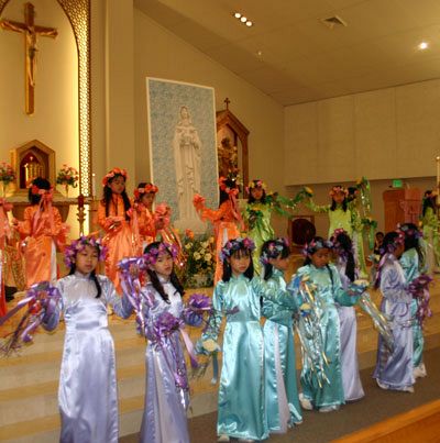 KEARNS — A Mass in honor of Mary May 7 was kicked off with the dedication and blessing of a vibrant white statue of Our Lady of Perpetual Help, the patron saint of the Vietnamese Parish in Kearns. The larger-than-life fiberglass statue was lovingly created by members of the Our Lady of Perpetual Help Parish. Placed in a niche three quarters up the west wall of the church, the statue was blessed by Diocesan Administrator Msgr. J. Terrence Fitzgerald, Pastor Father Dominic Thuy Dang Ha, and Father Colin Bircumshaw, pastor of St. Ann Parish, Salt Lake City, and a long-time supporter of the Vietnamese Parish. Inside the church, the Mass became a celebration of May as Mary’s month, with liturgical dancers presenting a bas relief of the newly dedicated statue with fresh flowers. In his homily, translated by Fr. Thuy, Msgr. Fitzgerald spoke of the growing Vietnamese Catholic community at Our Lady of Perpetual Help Parish, recognizing old faces and pointing out new ones, too. "Fr. Thuy tells me the dedication of this statue is his last big project," Msgr. Fitzgerald said. "I don’t believe it." May 7 marks the Feast of the Good Shepherd, Msgr. Fitzgerald said. "The diocese is looking forward to ordaining four new priests and two new deacons. Priests come forth from our communities because of prayer, and we must pray that priests come out of the Vietnamese community as well." Msgr. Fitzgerald thanked the Vietnamese Catholic community for their support of the Diocesan Development Drive, which helps pay for the education of seminarians and deacons. "After the resurrection of Jesus, God sent the Holy Spirit to bring love to all of us," Msgr. Fitzgerald said. "Jesus reminds us that we are called to be brothers and sisters in faith, to support each other on our journeys in faith... All of us have needs, and we must become more whole in our relationship with God. Many people don’t value what we value – the sacredness of human life; our commitment to vocations; the promises made and kept all our lives. St. John, in his Gospel, reminds us to see what love the father has bestowed upon us so we can become people of love.