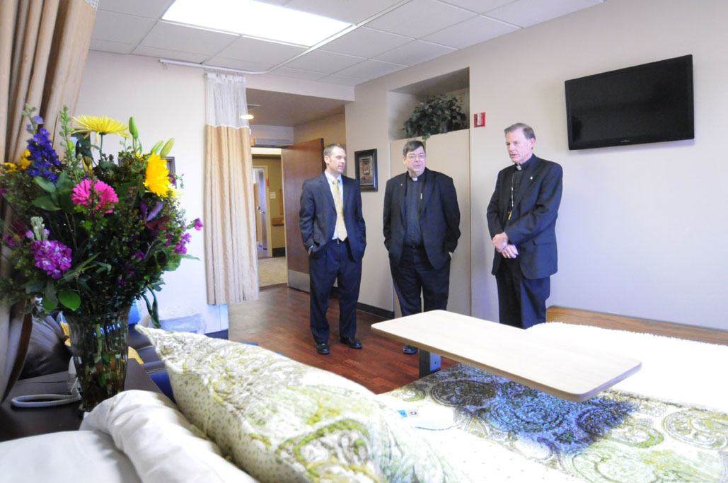 From right, the Most Rev. John C. Wester, Bishop of Salt Lake City and Monsignor Colin F. Bircumshaw, the diocese’s vicar general, view a remodeled rehabilitation room at St. Joseph Villa in Salt Lake City with Matt Church, the facility’s administrator, during an open house on March 22. Three retired priests of the diocese live in apartments at St. Joseph Villa, which remodeled its physical therapy room and the floor where patients live while receiving therapy. The new interior decorating is "a little softer, a little warmer, it makes it a little more inviting and less hospital-like," Church said. "While we certainly are a medical facility, we want to make sure that when they come here they’re as comfortable as they possibly can be." The villa also renovated its reception area; additional remodeling is planned during the upcoming year.