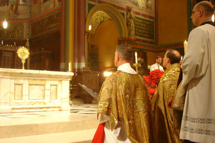 SALT LAKE CITY — National Vocation Awareness Week is Jan. 11 – 17, 2009, starting on the Feast of the Baptism of the Lord. During this period, Catholics are called to pray especially for an increase in vocations to religious life and the priesthood, and to ponder the call to follow Jesus received at their baptisms. "We are called and formed to be one with Christ in his passion and resurrection," said the Most Rev. John C. Wester, bishop of the Diocese of Salt Lake City during Evening Prayer with Benediction, part of National Vocation Awareness Week, at the Cathedral of the Madeleine Jan. 11. Baptism, he said, calls us to practice the mystery of vulnerability and kindness exemplified when God all-powerful, who created everything, became one of us. This call is hard to answer especially when images everywhere tell us violence and power should be our ideals. Celebrities and the arms they carry are a good example that in our culture "violence and power get bigger with each generation," said Bishop Wester. Humphrey Bogart carried a small gun, then Clint Eastwood came along with a rifle, Sylvester Stallone followed him with a canon, and finally Arnold Schwarzenegger came out with a tank or a bazooka, he said. "We are conditioned to be powerful… but we are called to a different role, that of a servant," he said echoing the words of the evening’s reading: Thus says the Lord: Here is my servant whom I uphold, my chosen one with whom I am pleased, upon whom I have put my spirit; he shall bring forth justice to the nations, not crying out, not shouting, not making his voice heard in the street. A bruised reed he shall not break, and a smoldering wick he shall not quench, until he establishes justice on earth; the coastlands will wait for his teaching. (Isaiah 42:1-4) As servants, we are called to put somebody else first, to bring hope, love, peace, and courage to others, and to recognize we are vulnerable and fragile. "When we know we are weak… Christ can work with us and use us," said Bishop Wester. Evening of Prayer with Benediction was organized by the Office of Vocations and the Office of Liturgy in an effort to bring the community together to pray for vocations before the Blessed Sacrament. The evening started with dim lighting in the Cathedral to emphasize the presence of the Paschal Candle. Each assembly member lit the candle he or she was holding as the Paschal Candle passed by under the guard of the Knights of Columbus. "We ask the Lord to kindle within us the flame of faith," said Bishop Wester during the homily. After the Benediction, Bishop Wester gave thanks to Father Colin F. Bircumshaw, Director of Vocations, and Father Javier Virgen, associate director of Vocations and vicar for Hispanic Affairs, for assisting him at the altar, and to the choir for their uplifting music. Then, he gave special thanks to the Knights of Columbus for the stipend they collect for the seminarians of the diocese. "I know sometimes it is a sacrifice to your members to come forward with that," he said. The bishop also invited the assembly to gather again in prayer. "There is a certain power of prayer when we work together."