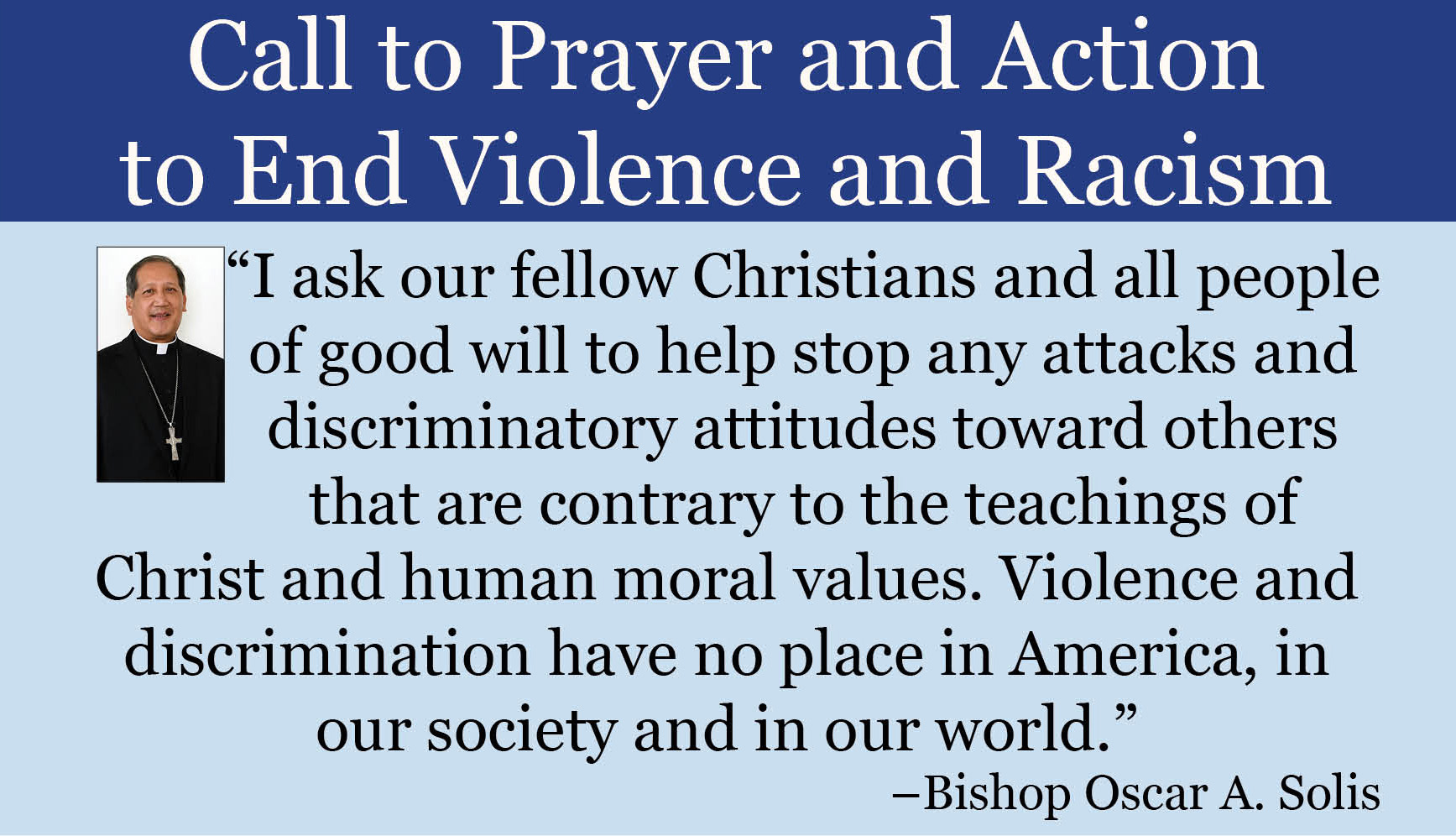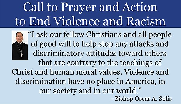 The Catholic Church strongly condemns racism and renounces racial discrimination, categorizations or presumptions. I ask our fellow Christians and all people of good will to help stop any attacks and discriminatory attitudes toward others that are contrary to the teachings of Christ and human moral values. Violence and discrimination have no place in America, in our society and in our world. We must instead uphold and fight for the ideals of this great nation, strengthen our fraternal bonds as brothers and sisters, and recognize that each of us is created in the image of God with equal human dignity and rights.