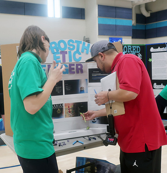 For Everett Mendenhall, 13, an eighth-grade student at Our Lady of Lourdes Catholic School, the science fair project allowed him to combine his interest in 3-D printing with the chance to help someone else. He designed and built a working prosthetic finger for his teacher Josh Hegvik, who had lost the digit in a construction accident.