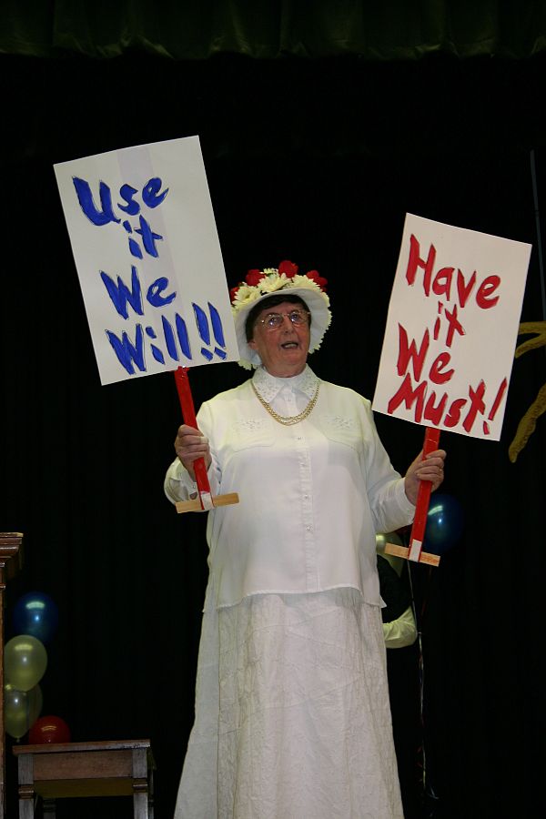 SALT LAKE CITY — To the tune of "Happy Days are Here Again," the suffragettes sang "Voting day will soon be here. Our cries were heard throughout the years. On election day don’t you sit still. We have the vote, use it we will." The suffragettes were played by various performers in the skit "We’ve Come a Long Way," written by Joan Erbin at the CHRISTUS Saint Joseph Villa Volunteer luncheon held in the Saint Ann Recreation Center Nov. 1. The luncheon was held to raise funds for the residents. "This is the only fund raiser we have all year," said Joan Mirka, CHRISTA Saint Joseph Villa Volunteer president. "We use the funds to buy Mother’s and Father’s Day gifts, and for the residents’ weekly games. It also provides funds for the residents’ birthday parties and art and craft supplies. We will be celebrating the 50th anniversary of our organization next May. Mirka said the volunteers run the gift shop, make visits to the residents, decorate the lunchroom, and most important, visit with the residents. As for the skit, Mirka said playing Elizabeth Cady Stanton, "I’m not the one who had the fame. To England I went to further the cause, but we came back home without applause. "I’m sure you ladies have heard of me. For women’s rights my voice did wail," said Ginger Moulton, CHRISTUS Saint Joseph Villa director of development, as Susan B. Anthony. "At one time, I ended up in jail." "I too fought the battle," said Julia Ward Howe, played by Sister of Charity of the Incarnate Word Margaret Collins. "If you don’t vote, some one will tattle. We want you ladies to please take note, 71 years it took to win the vote." Stanton really began the entire suffrage movement. She went to England in 1840 to attend a World Anti-Slavery Meeting, while on her honeymoon. She married a young abolitionist who traveled all over the country giving anti-slavery talks. She attended the meeting, but was not allowed to speak or vote. After Stanton’s children were grown, she and Anthony traveled around the country for their cause. They even came to Utah at the invitation of some Mormon women, who mostly asked questions about divorce. Stanton used to play in her father’s law office and listen to him talk to woman who came to him for advice. He was usually unable to help them because of all the laws favoring men. Lucretia Mott, played by Jean Prather, and Stanton worked for years on ways to obtain equal rights and voting rights for women. One day while sitting over tea, they decided to call a public meeting, a convention in Seneca Falls, N.Y. It was the first of its kind. They put ads in the newspaper, passed out flyers, and gave talks on street corners. On the morning of July 19, 1848, a huge crowd of all kinds of women and some men came to the convention. They gathered outside Wesleyan Chapel. Stanton wrote a Declaration of Independence for Women, which she patterned after the United States Declaration of Independence. In it she listed the right to seek and keep money women earned, to go to college, to own property, and the right to vote. Everyone at the convention signed the declaration. But the next day, some men made their wives and daughters remove their names from the declaration. They closed the convention with the motto, "Have it we must, Use it we will!" "I published a woman’s newspaper, "The Lily," said Amelia Bloomer, played by Sister of the Incarnate Word Stephen Guiry. I wrote most of the articles. Someone sent in a whole pattern for Turkish pants for women to wear under a shortened skirt, to be printed in the newspaper. I called them bloomers. Women were not allowed to wear bloomers until the bicycle was invented. They could only wear them while they were riding the bicycle, and then they and to change back into a dress." Most men opposed the suffrage movement, and declared women’s brains were unequal to men. As a result of the opposition, many women went to jail. Alice Paul, played by Sister of Charity of the Incarnate Word Ignatia Driscoll, was brought up a Quaker like Mott. Quaker women were viewed as equal to men. "But I saw a need for change," said Paul. "I organized a women’s march of peaceful protesters down Pennsylvania Avenue. We were all dressed in long white gowns with pretty flowered hats. We carried big signs asking for the right to vote. We were attacked with stones and the police refused to protect us. By the time the U.S. Calvary arrived to restore order, many were injured. They decided to teach us a lesson and put us in jail. They hit our heads against the walls, shoved us, and threw us to the floor. It was called "The Night of Terror – 1917." "But one of the women who came to the first convention in Seneca Falls in 1848, was still alive in August 1920, when the United States Congress passed into law the 19th Amendment to the Constitution giving American women the right to vote. Her name was Charlotte Woodward, and she was 91. We finally did it. So women, pledge to vote."