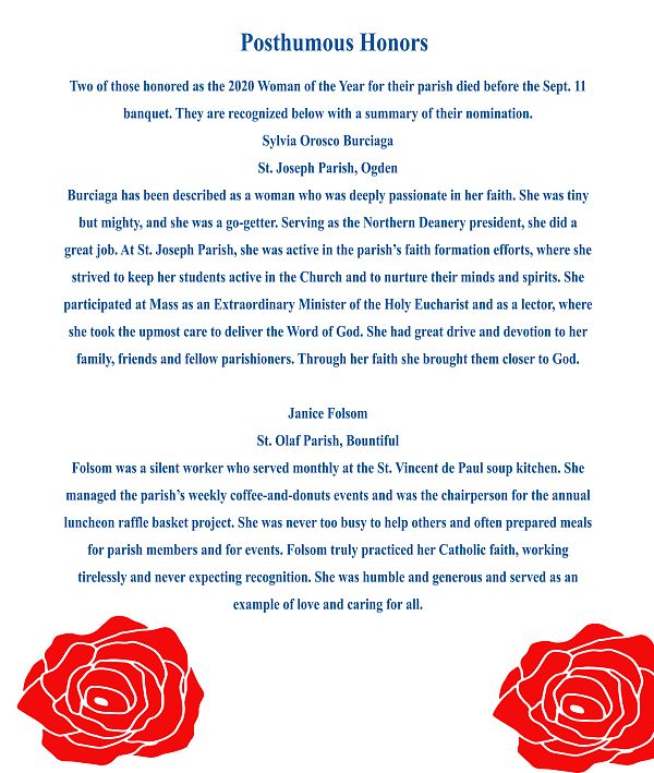 Two of those honored as the 2020 Woman of the Year for their parish died before the Sept. 11 banquet. They are recognized below with a summary of their nomination.
