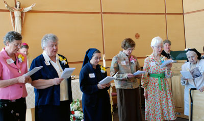 OGDEN — Twenty-nine women religious gathered April 12 at Mount Benedict Priory in Ogden to celebrate the years of service and prayer lived by seven sisters currently serving in the Diocese of Salt Lake City. Jubilarian sisters celebrated 40 years of religious life, 50 years, and 60 years. Holy Cross Sister Suzanne Brennan of Holy Cross Ministries marked 40 years of religious life. Daughter of Charity Sister Germaine Sarrazin, who serves with the Ladies of Charity and tutors elementary school students; Holy Cross Sister Joseph Cecile Voelker, pastoral associate, St. Joseph Parish, Ogden; Holy Cross Sister Yvonne Hatt, Pastoral associate in Cedar City and other parts of Southern Utah; and Carmelite Sister Mary Ann Krajicek of the cloistered Carmel of the Immaculate Heart of Mary are celebrating 50 years of religious life. Benedictine Sister Virgene Marx of Mount Benedict Priory; and Missionary Sister Paula Wellnitz of Home Place in Orangeville are marking 60 years of religious life. Carmelite Sister Mary Ann Krajicek could not attend the jubilee gathering because of her cloistered state. Most Reverend Bishop John C. Wester, bishop of the Diocese of Salt Lake City, spoke with all the sisters prior to the Mass. They discussed gifts and challenges present in the diocese. "We appreciate your deep commitment to the Gospel," the bishop told the sisters. You are an example to all of us of Church. Through you we are energized and we are inspired by your closeness to the people in the diocese. During the Jubilee Mass which was rich with music, Bishop Wester encouraged all the women religious to use Mary, the mother of Jesus, as their example. "God called Mary through the angel," he said. "And you draw us to God. We can look at Mary’s experience and example and gain some insight into yours." The bishop said Mary’s first response to the Angel Gabriel at the Annunciation was probably fear, confusion, and silence. "We all have moments of fear, confusion, and silence in the presence of God who called you to himself... God took you by the hand and he gave you the words to speak. "Your years of dedicated service touch our hearts and allay our fears. That even one of us is called to the professed life is a symbol of God in our midst." The bishop encouraged the jubilee sisters and their colleagues not to be afraid, and to have faith that Christ will give them the words they need to speak and spread the Word of God. The theme of the jubilee Mass was, "I will lead her into the desert and speak to her heart." The Mass was followed by a jubilee luncheon.