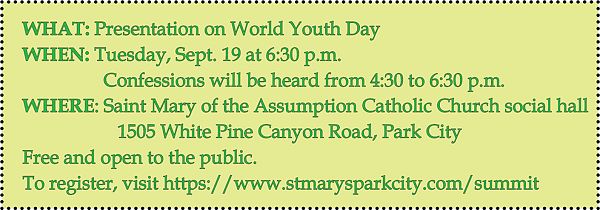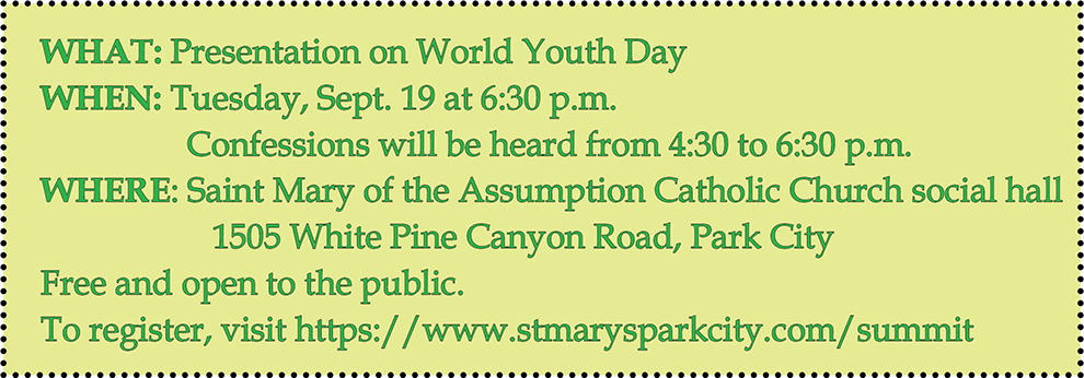 PARK CITY — For several months St. Mary of the Assumption Catholic Parish in Park City has been offering several opportunities for faith formation, most of which are open to people beyond the parish. This month’s presentation, by a young man who attended the 2023 World Youth Day, is one of these Parish Summits that is open to the wider community. Those attending will hear about John Shackelford’s pilgrim perspective, thoughts and experiences during the 2023 WYD in Lisbon, Portugal.