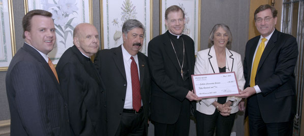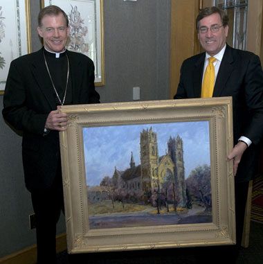 SALT LAKE CITY — At a private luncheon at the Alta Club in downtown Salt Lake City May 1, Zions Bank President and CEO A. Scott Anderson presented a check for $50,000 to Bishop John C. Wester of the Catholic Diocese of Salt Lake City and Catholic Community Services of Utah (CCS) Executive Director Maggie St. Claire. The donation will support CCS’ renovation of a new headquarters facility that will house treatment services, men and women’s residential substance abuse programs, refugee resettlement and immigration, and administration offices. In addition, Anderson announced he had commissioned local artist Ruby Chacon to paint a mural in the new CCS building. He also presented Bishop Wester with a painting of the Cathedral of the Madeleine by Utah artist Larry Wade. "We commend Catholic Community Services for its stewardship in providing resources and support for the people of Salt Lake City," said Anderson. "Zions Bank is proud to make this donation toward this new facility that will enable the organization to continue its legacy of quality service to members of our community." In December of 2005 Intermountain Healthcare generously donated its clinic property at 745 East 300 South to CCS. Since January 2006, CCS has been working on a $3,000,000 capital campaign to fund the renovation of the building into a campus-style facility. The grounds will include two playgrounds for the children of the women residents. The living quarters are designed for comfort as well as function. The location is convenient to TRAX and bus lines, which will help CCS’ off-site clients to access the services.